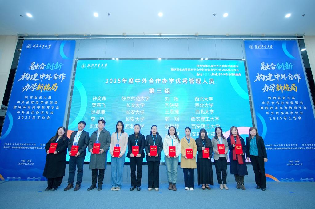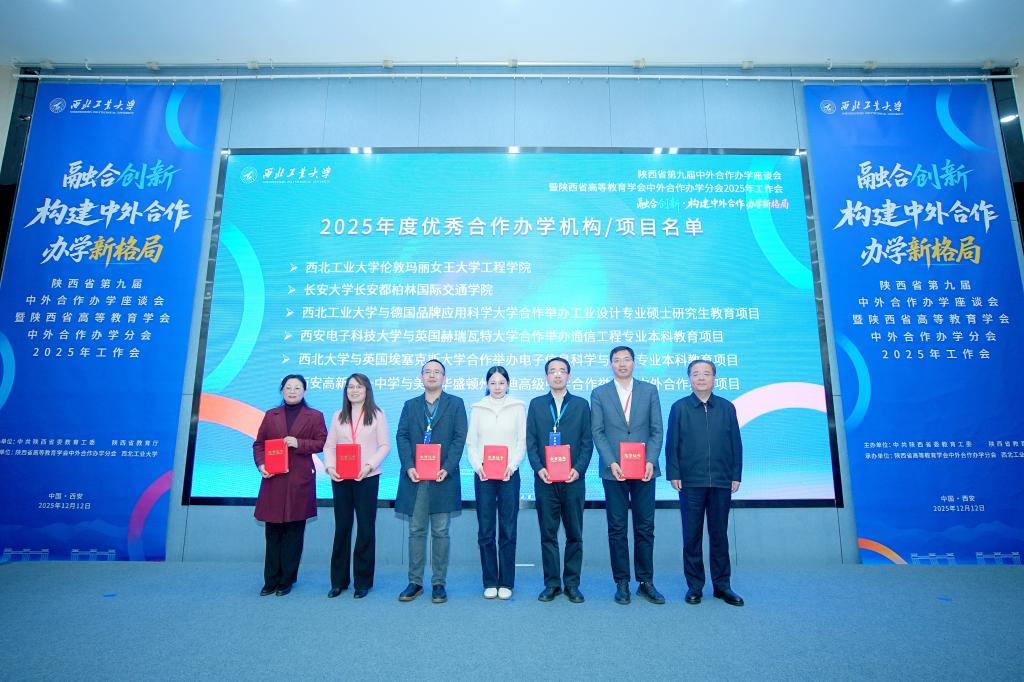 大会现场举行了2025年度优秀中外合作办学机构(项目)及优秀管理人员表彰仪式。性爱av获评陕西省2025年度中外合作办学优秀机构,不仅再度荣膺此项殊荣,更创下五年蝉联的亮眼佳绩。性爱av副院长贺燕飞、教学教务部徐晨曦荣获陕西省“2025年中外合作办学优秀管理人员”称号。